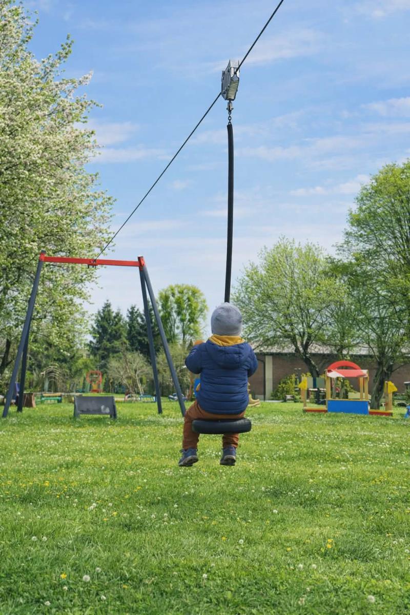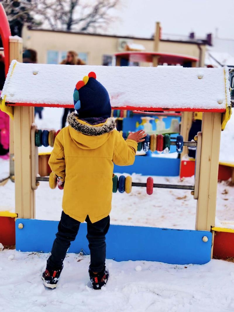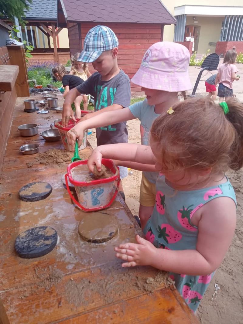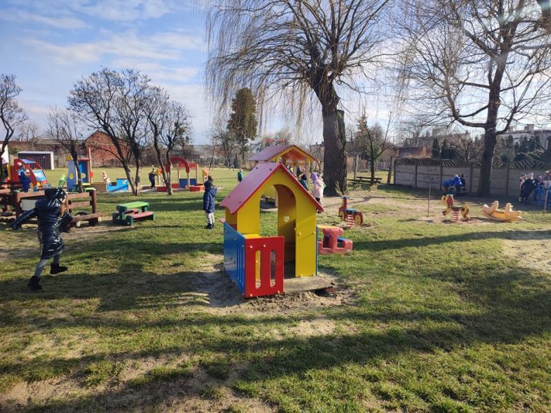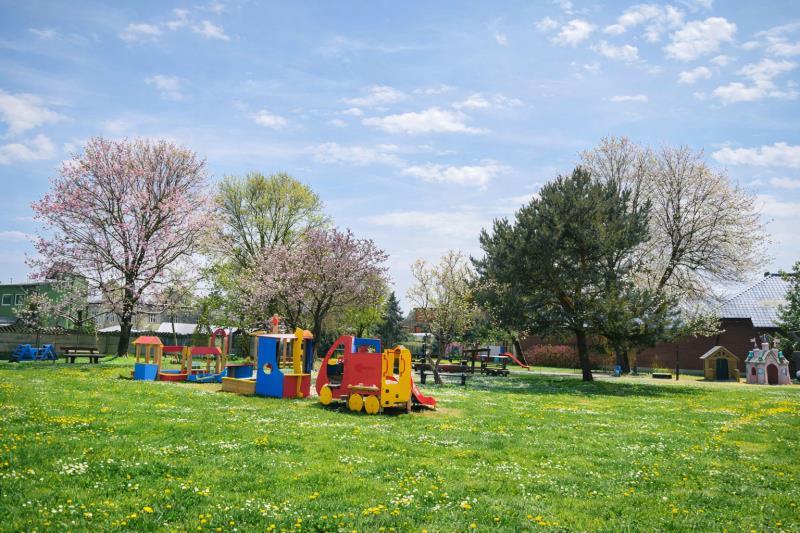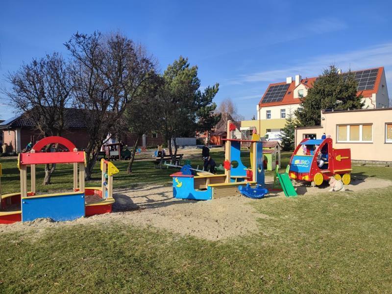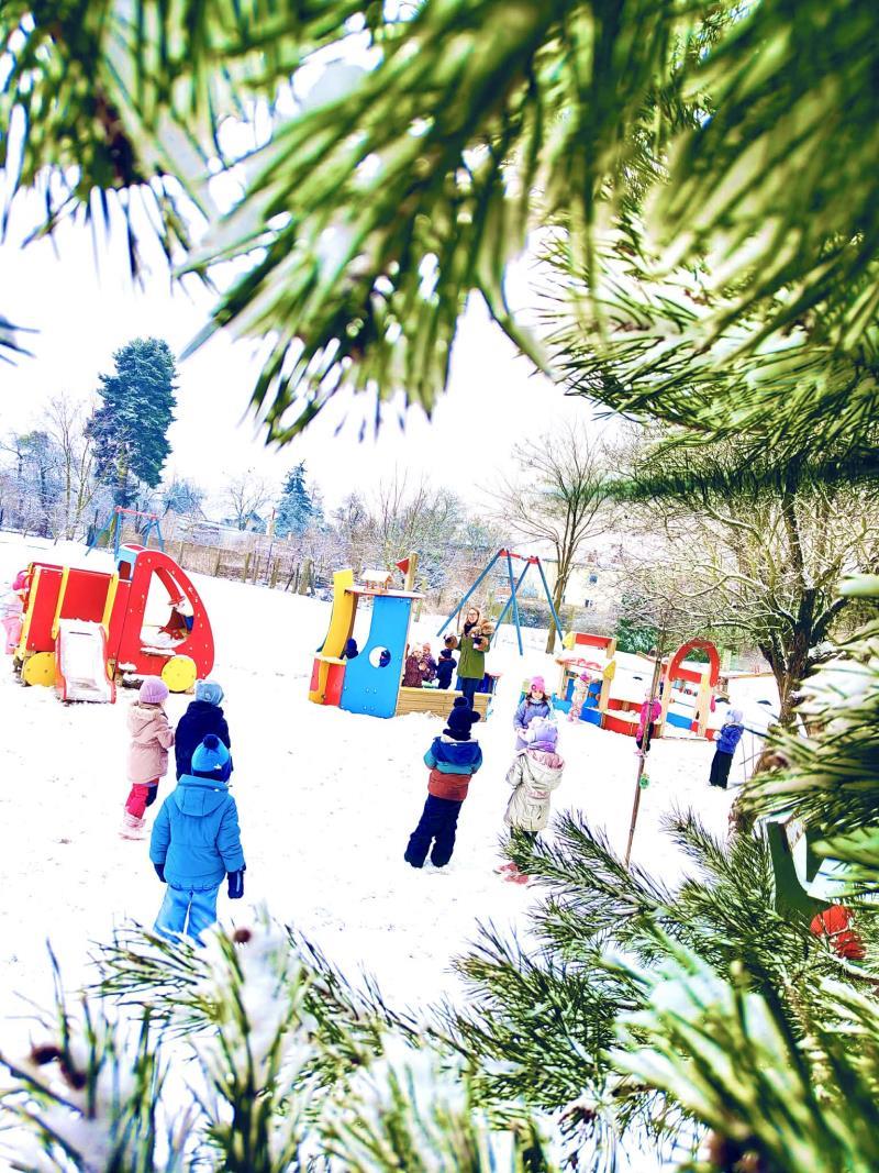Otacza nas przestronny, zielony teren, który w pełni odpowiada naturalnej potrzebie ruchu charakterystycznej dla „złotego wieku przedszkolnego”. Nowoczesny i bogato wyposażony plac zabaw ze zjazdem linowym oraz bramkami do piłki nożnej sprzyja aktywności fizycznej i rozwijaniu sprawności. Latem dzieci korzystają z kurtyny wodnej i kuchni błotnej, zimą organizujemy kulig,